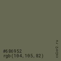 Цвет #686952 в цветовой модели RGB обозначается тремя октетами (104, 105, 82) в десятичном формате и #686952 в шестнадцатиричном (hex) формате, которые являются интенсивностью красного 104 (hex 68), интенсивность зелёного 105 (hex 69) и интенсивность синего 82 (hex 52).