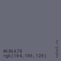 Цвет #686A78 в цветовой модели RGB обозначается тремя октетами (104, 106, 120) в десятичном формате и #686A78 в шестнадцатиричном (hex) формате, которые являются интенсивностью красного 104 (hex 68), интенсивность зелёного 106 (hex 6A) и интенсивность синего 120 (hex 78).