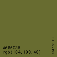 Цвет #686C30 в цветовой модели RGB обозначается тремя октетами (104, 108, 48) в десятичном формате и #686C30 в шестнадцатиричном (hex) формате, которые являются интенсивностью красного 104 (hex 68), интенсивность зелёного 108 (hex 6C) и интенсивность синего 48 (hex 30).