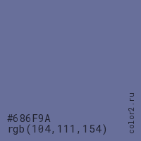 Цвет #686F9A в цветовой модели RGB обозначается тремя октетами (104, 111, 154) в десятичном формате и #686F9A в шестнадцатиричном (hex) формате, которые являются интенсивностью красного 104 (hex 68), интенсивность зелёного 111 (hex 6F) и интенсивность синего 154 (hex 9A).