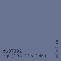 Цвет #687392 в цветовой модели RGB обозначается тремя октетами (104, 115, 146) в десятичном формате и #687392 в шестнадцатиричном (hex) формате, которые являются интенсивностью красного 104 (hex 68), интенсивность зелёного 115 (hex 73) и интенсивность синего 146 (hex 92).