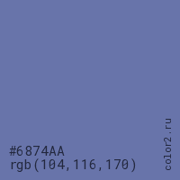 Цвет #6874AA в цветовой модели RGB обозначается тремя октетами (104, 116, 170) в десятичном формате и #6874AA в шестнадцатиричном (hex) формате, которые являются интенсивностью красного 104 (hex 68), интенсивность зелёного 116 (hex 74) и интенсивность синего 170 (hex AA).
