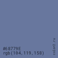 Цвет #68779E в цветовой модели RGB обозначается тремя октетами (104, 119, 158) в десятичном формате и #68779E в шестнадцатиричном (hex) формате, которые являются интенсивностью красного 104 (hex 68), интенсивность зелёного 119 (hex 77) и интенсивность синего 158 (hex 9E).