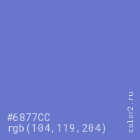 Цвет #6877CC в цветовой модели RGB обозначается тремя октетами (104, 119, 204) в десятичном формате и #6877CC в шестнадцатиричном (hex) формате, которые являются интенсивностью красного 104 (hex 68), интенсивность зелёного 119 (hex 77) и интенсивность синего 204 (hex CC).