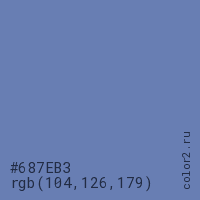 Цвет #687EB3 в цветовой модели RGB обозначается тремя октетами (104, 126, 179) в десятичном формате и #687EB3 в шестнадцатиричном (hex) формате, которые являются интенсивностью красного 104 (hex 68), интенсивность зелёного 126 (hex 7E) и интенсивность синего 179 (hex B3).