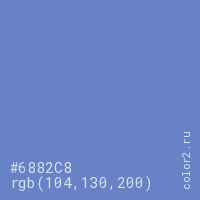 Цвет #6882C8 в цветовой модели RGB обозначается тремя октетами (104, 130, 200) в десятичном формате и #6882C8 в шестнадцатиричном (hex) формате, которые являются интенсивностью красного 104 (hex 68), интенсивность зелёного 130 (hex 82) и интенсивность синего 200 (hex C8).
