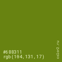Цвет #688311 в цветовой модели RGB обозначается тремя октетами (104, 131, 17) в десятичном формате и #688311 в шестнадцатиричном (hex) формате, которые являются интенсивностью красного 104 (hex 68), интенсивность зелёного 131 (hex 83) и интенсивность синего 17 (hex 11).