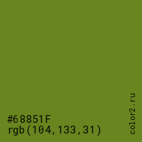 Цвет #68851F в цветовой модели RGB обозначается тремя октетами (104, 133, 31) в десятичном формате и #68851F в шестнадцатиричном (hex) формате, которые являются интенсивностью красного 104 (hex 68), интенсивность зелёного 133 (hex 85) и интенсивность синего 31 (hex 1F).
