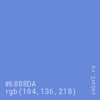 Цвет #6888DA в цветовой модели RGB обозначается тремя октетами (104, 136, 218) в десятичном формате и #6888DA в шестнадцатиричном (hex) формате, которые являются интенсивностью красного 104 (hex 68), интенсивность зелёного 136 (hex 88) и интенсивность синего 218 (hex DA).
