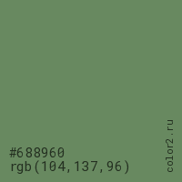 Цвет #688960 в цветовой модели RGB обозначается тремя октетами (104, 137, 96) в десятичном формате и #688960 в шестнадцатиричном (hex) формате, которые являются интенсивностью красного 104 (hex 68), интенсивность зелёного 137 (hex 89) и интенсивность синего 96 (hex 60).