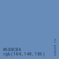 Цвет #688CBA в цветовой модели RGB обозначается тремя октетами (104, 140, 186) в десятичном формате и #688CBA в шестнадцатиричном (hex) формате, которые являются интенсивностью красного 104 (hex 68), интенсивность зелёного 140 (hex 8C) и интенсивность синего 186 (hex BA).