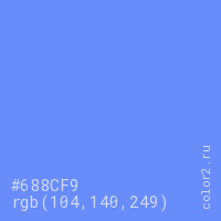Цвет #688CF9 в цветовой модели RGB обозначается тремя октетами (104, 140, 249) в десятичном формате и #688CF9 в шестнадцатиричном (hex) формате, которые являются интенсивностью красного 104 (hex 68), интенсивность зелёного 140 (hex 8C) и интенсивность синего 249 (hex F9).