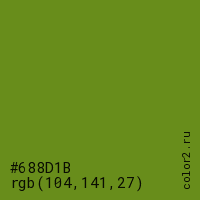 Цвет #688D1B в цветовой модели RGB обозначается тремя октетами (104, 141, 27) в десятичном формате и #688D1B в шестнадцатиричном (hex) формате, которые являются интенсивностью красного 104 (hex 68), интенсивность зелёного 141 (hex 8D) и интенсивность синего 27 (hex 1B).