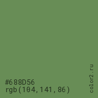 Цвет #688D56 в цветовой модели RGB обозначается тремя октетами (104, 141, 86) в десятичном формате и #688D56 в шестнадцатиричном (hex) формате, которые являются интенсивностью красного 104 (hex 68), интенсивность зелёного 141 (hex 8D) и интенсивность синего 86 (hex 56).