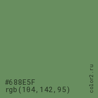 Цвет #688E5F в цветовой модели RGB обозначается тремя октетами (104, 142, 95) в десятичном формате и #688E5F в шестнадцатиричном (hex) формате, которые являются интенсивностью красного 104 (hex 68), интенсивность зелёного 142 (hex 8E) и интенсивность синего 95 (hex 5F).