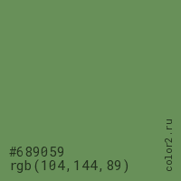 Цвет #689059 в цветовой модели RGB обозначается тремя октетами (104, 144, 89) в десятичном формате и #689059 в шестнадцатиричном (hex) формате, которые являются интенсивностью красного 104 (hex 68), интенсивность зелёного 144 (hex 90) и интенсивность синего 89 (hex 59).