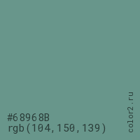 Цвет #68968B в цветовой модели RGB обозначается тремя октетами (104, 150, 139) в десятичном формате и #68968B в шестнадцатиричном (hex) формате, которые являются интенсивностью красного 104 (hex 68), интенсивность зелёного 150 (hex 96) и интенсивность синего 139 (hex 8B).