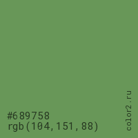 Цвет #689758 в цветовой модели RGB обозначается тремя октетами (104, 151, 88) в десятичном формате и #689758 в шестнадцатиричном (hex) формате, которые являются интенсивностью красного 104 (hex 68), интенсивность зелёного 151 (hex 97) и интенсивность синего 88 (hex 58).