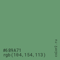 Цвет #689A71 в цветовой модели RGB обозначается тремя октетами (104, 154, 113) в десятичном формате и #689A71 в шестнадцатиричном (hex) формате, которые являются интенсивностью красного 104 (hex 68), интенсивность зелёного 154 (hex 9A) и интенсивность синего 113 (hex 71).