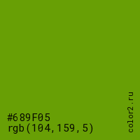 Цвет #689F05 в цветовой модели RGB обозначается тремя октетами (104, 159, 5) в десятичном формате и #689F05 в шестнадцатиричном (hex) формате, которые являются интенсивностью красного 104 (hex 68), интенсивность зелёного 159 (hex 9F) и интенсивность синего 5 (hex 05).