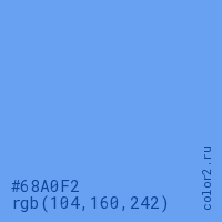 Цвет #68A0F2 в цветовой модели RGB обозначается тремя октетами (104, 160, 242) в десятичном формате и #68A0F2 в шестнадцатиричном (hex) формате, которые являются интенсивностью красного 104 (hex 68), интенсивность зелёного 160 (hex A0) и интенсивность синего 242 (hex F2).