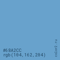Цвет #68A2CC в цветовой модели RGB обозначается тремя октетами (104, 162, 204) в десятичном формате и #68A2CC в шестнадцатиричном (hex) формате, которые являются интенсивностью красного 104 (hex 68), интенсивность зелёного 162 (hex A2) и интенсивность синего 204 (hex CC).