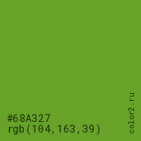 Цвет #68A327 в цветовой модели RGB обозначается тремя октетами (104, 163, 39) в десятичном формате и #68A327 в шестнадцатиричном (hex) формате, которые являются интенсивностью красного 104 (hex 68), интенсивность зелёного 163 (hex A3) и интенсивность синего 39 (hex 27).