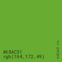 Цвет #68AC31 в цветовой модели RGB обозначается тремя октетами (104, 172, 49) в десятичном формате и #68AC31 в шестнадцатиричном (hex) формате, которые являются интенсивностью красного 104 (hex 68), интенсивность зелёного 172 (hex AC) и интенсивность синего 49 (hex 31).
