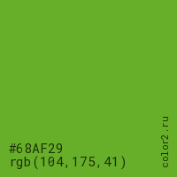 Цвет #68AF29 в цветовой модели RGB обозначается тремя октетами (104, 175, 41) в десятичном формате и #68AF29 в шестнадцатиричном (hex) формате, которые являются интенсивностью красного 104 (hex 68), интенсивность зелёного 175 (hex AF) и интенсивность синего 41 (hex 29).