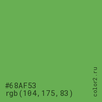 Цвет #68AF53 в цветовой модели RGB обозначается тремя октетами (104, 175, 83) в десятичном формате и #68AF53 в шестнадцатиричном (hex) формате, которые являются интенсивностью красного 104 (hex 68), интенсивность зелёного 175 (hex AF) и интенсивность синего 83 (hex 53).