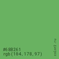 Цвет #68B261 в цветовой модели RGB обозначается тремя октетами (104, 178, 97) в десятичном формате и #68B261 в шестнадцатиричном (hex) формате, которые являются интенсивностью красного 104 (hex 68), интенсивность зелёного 178 (hex B2) и интенсивность синего 97 (hex 61).