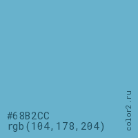 Цвет #68B2CC в цветовой модели RGB обозначается тремя октетами (104, 178, 204) в десятичном формате и #68B2CC в шестнадцатиричном (hex) формате, которые являются интенсивностью красного 104 (hex 68), интенсивность зелёного 178 (hex B2) и интенсивность синего 204 (hex CC).