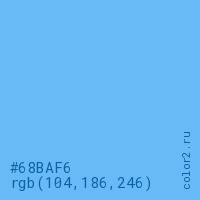 Цвет #68BAF6 в цветовой модели RGB обозначается тремя октетами (104, 186, 246) в десятичном формате и #68BAF6 в шестнадцатиричном (hex) формате, которые являются интенсивностью красного 104 (hex 68), интенсивность зелёного 186 (hex BA) и интенсивность синего 246 (hex F6).