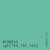Цвет #68BBA5 в цветовой модели RGB обозначается тремя октетами (104, 187, 165) в десятичном формате и #68BBA5 в шестнадцатиричном (hex) формате, которые являются интенсивностью красного 104 (hex 68), интенсивность зелёного 187 (hex BB) и интенсивность синего 165 (hex A5).