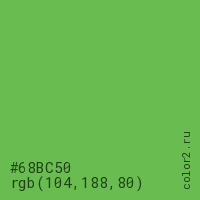 Цвет #68BC50 в цветовой модели RGB обозначается тремя октетами (104, 188, 80) в десятичном формате и #68BC50 в шестнадцатиричном (hex) формате, которые являются интенсивностью красного 104 (hex 68), интенсивность зелёного 188 (hex BC) и интенсивность синего 80 (hex 50).
