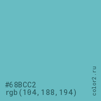 Цвет #68BCC2 в цветовой модели RGB обозначается тремя октетами (104, 188, 194) в десятичном формате и #68BCC2 в шестнадцатиричном (hex) формате, которые являются интенсивностью красного 104 (hex 68), интенсивность зелёного 188 (hex BC) и интенсивность синего 194 (hex C2).