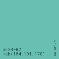 Цвет #68BFB2 в цветовой модели RGB обозначается тремя октетами (104, 191, 178) в десятичном формате и #68BFB2 в шестнадцатиричном (hex) формате, которые являются интенсивностью красного 104 (hex 68), интенсивность зелёного 191 (hex BF) и интенсивность синего 178 (hex B2).