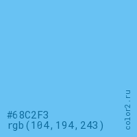 Цвет #68C2F3 в цветовой модели RGB обозначается тремя октетами (104, 194, 243) в десятичном формате и #68C2F3 в шестнадцатиричном (hex) формате, которые являются интенсивностью красного 104 (hex 68), интенсивность зелёного 194 (hex C2) и интенсивность синего 243 (hex F3).