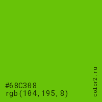 Цвет #68C308 в цветовой модели RGB обозначается тремя октетами (104, 195, 8) в десятичном формате и #68C308 в шестнадцатиричном (hex) формате, которые являются интенсивностью красного 104 (hex 68), интенсивность зелёного 195 (hex C3) и интенсивность синего 8 (hex 08).