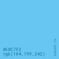 Цвет #68C7F2 в цветовой модели RGB обозначается тремя октетами (104, 199, 242) в десятичном формате и #68C7F2 в шестнадцатиричном (hex) формате, которые являются интенсивностью красного 104 (hex 68), интенсивность зелёного 199 (hex C7) и интенсивность синего 242 (hex F2).