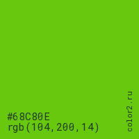 Цвет #68C80E в цветовой модели RGB обозначается тремя октетами (104, 200, 14) в десятичном формате и #68C80E в шестнадцатиричном (hex) формате, которые являются интенсивностью красного 104 (hex 68), интенсивность зелёного 200 (hex C8) и интенсивность синего 14 (hex 0E).
