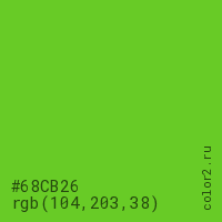 Цвет #68CB26 в цветовой модели RGB обозначается тремя октетами (104, 203, 38) в десятичном формате и #68CB26 в шестнадцатиричном (hex) формате, которые являются интенсивностью красного 104 (hex 68), интенсивность зелёного 203 (hex CB) и интенсивность синего 38 (hex 26).