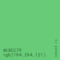 Цвет #68CC79 в цветовой модели RGB обозначается тремя октетами (104, 204, 121) в десятичном формате и #68CC79 в шестнадцатиричном (hex) формате, которые являются интенсивностью красного 104 (hex 68), интенсивность зелёного 204 (hex CC) и интенсивность синего 121 (hex 79).