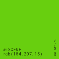 Цвет #68CF0F в цветовой модели RGB обозначается тремя октетами (104, 207, 15) в десятичном формате и #68CF0F в шестнадцатиричном (hex) формате, которые являются интенсивностью красного 104 (hex 68), интенсивность зелёного 207 (hex CF) и интенсивность синего 15 (hex 0F).