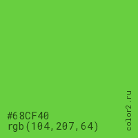 Цвет #68CF40 в цветовой модели RGB обозначается тремя октетами (104, 207, 64) в десятичном формате и #68CF40 в шестнадцатиричном (hex) формате, которые являются интенсивностью красного 104 (hex 68), интенсивность зелёного 207 (hex CF) и интенсивность синего 64 (hex 40).