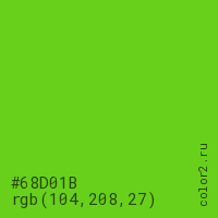 Цвет #68D01B в цветовой модели RGB обозначается тремя октетами (104, 208, 27) в десятичном формате и #68D01B в шестнадцатиричном (hex) формате, которые являются интенсивностью красного 104 (hex 68), интенсивность зелёного 208 (hex D0) и интенсивность синего 27 (hex 1B).