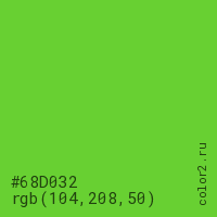 Цвет #68D032 в цветовой модели RGB обозначается тремя октетами (104, 208, 50) в десятичном формате и #68D032 в шестнадцатиричном (hex) формате, которые являются интенсивностью красного 104 (hex 68), интенсивность зелёного 208 (hex D0) и интенсивность синего 50 (hex 32).