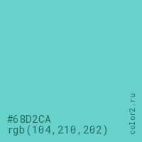 Цвет #68D2CA в цветовой модели RGB обозначается тремя октетами (104, 210, 202) в десятичном формате и #68D2CA в шестнадцатиричном (hex) формате, которые являются интенсивностью красного 104 (hex 68), интенсивность зелёного 210 (hex D2) и интенсивность синего 202 (hex CA).