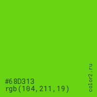 Цвет #68D313 в цветовой модели RGB обозначается тремя октетами (104, 211, 19) в десятичном формате и #68D313 в шестнадцатиричном (hex) формате, которые являются интенсивностью красного 104 (hex 68), интенсивность зелёного 211 (hex D3) и интенсивность синего 19 (hex 13).