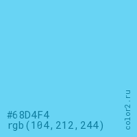 Цвет #68D4F4 в цветовой модели RGB обозначается тремя октетами (104, 212, 244) в десятичном формате и #68D4F4 в шестнадцатиричном (hex) формате, которые являются интенсивностью красного 104 (hex 68), интенсивность зелёного 212 (hex D4) и интенсивность синего 244 (hex F4).